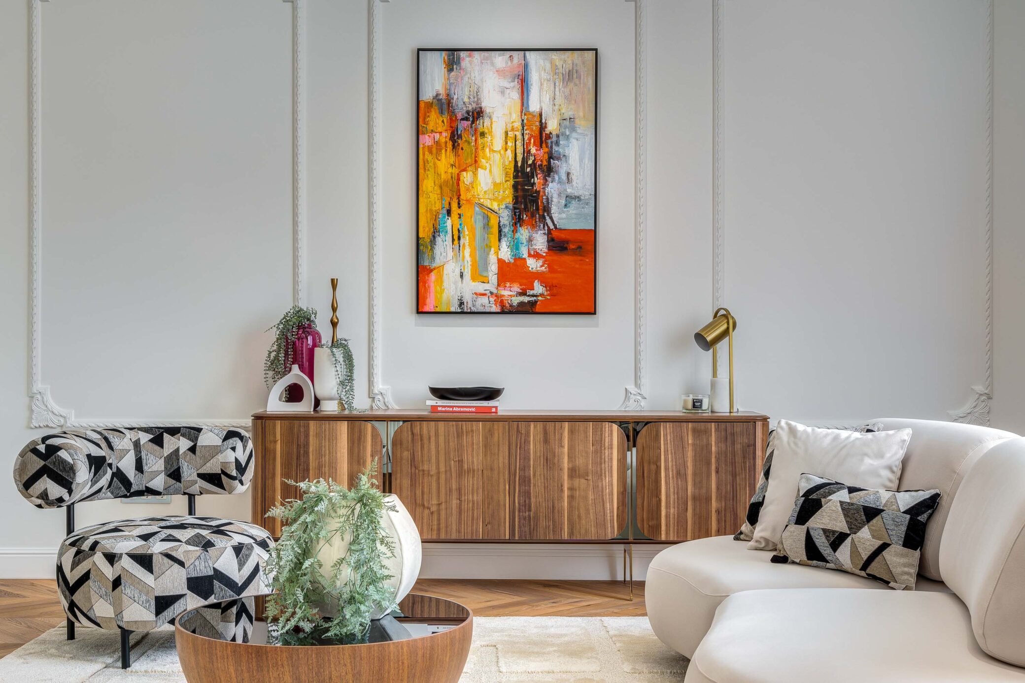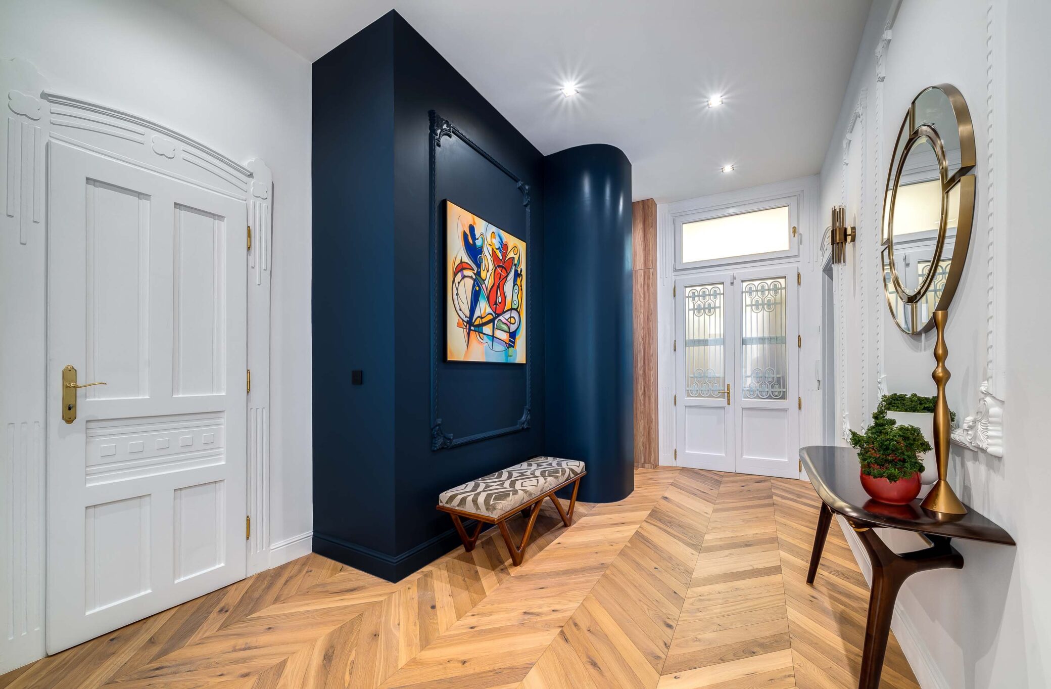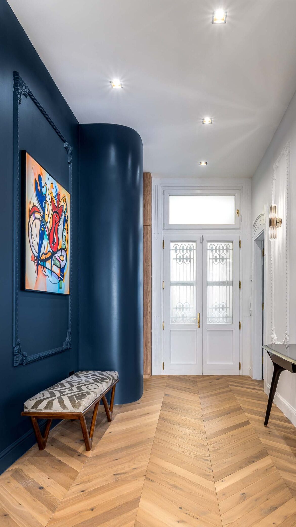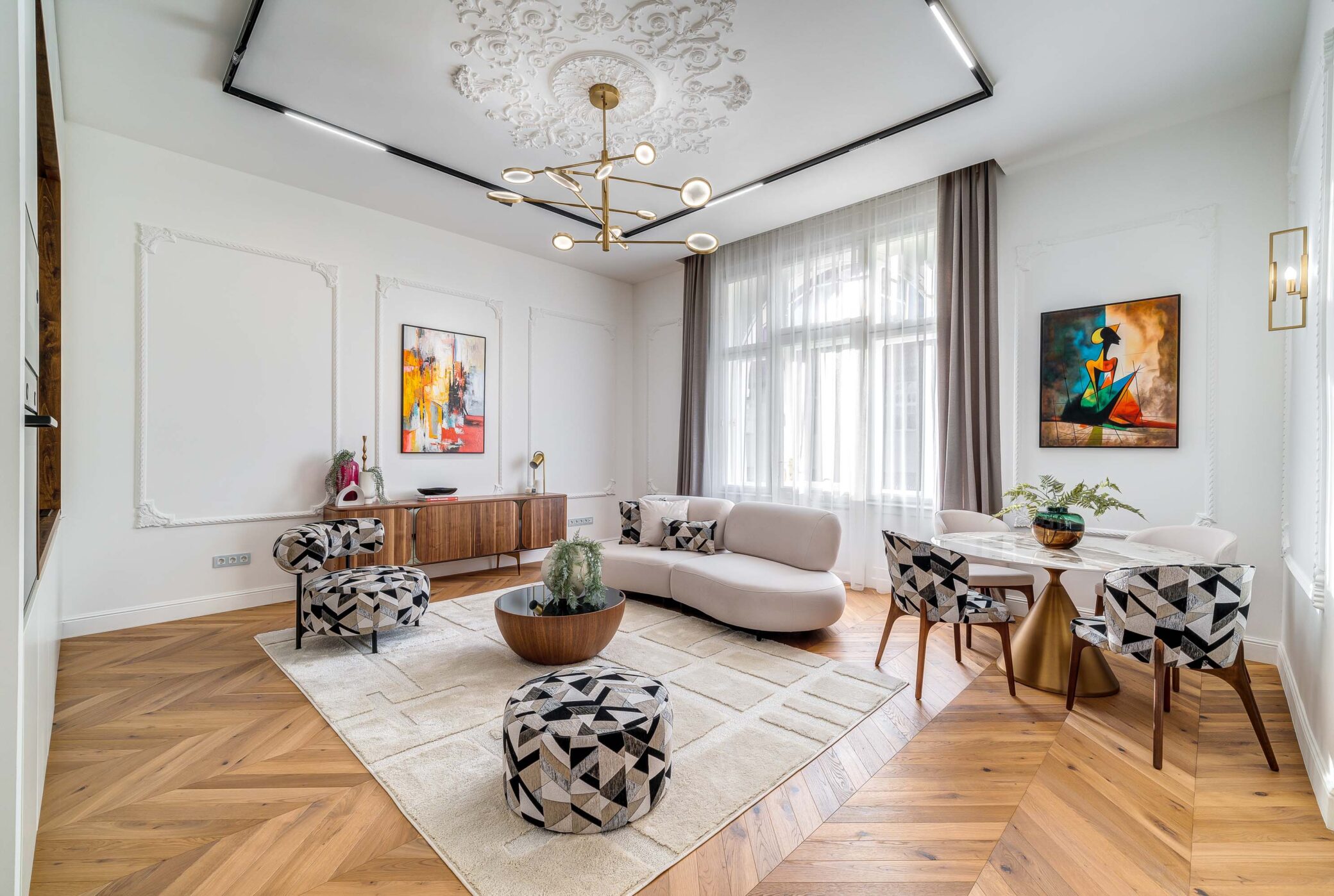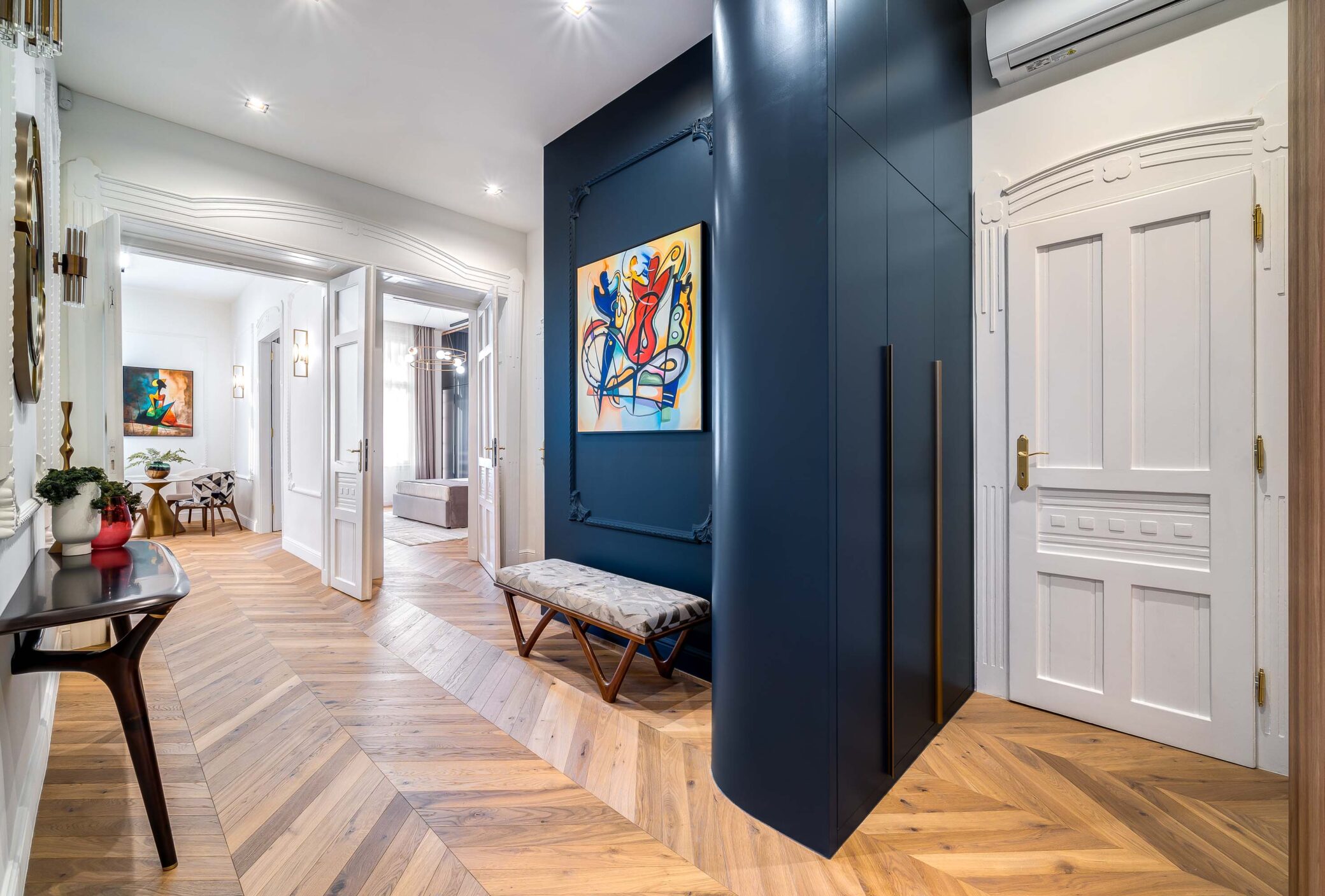 A különböző elemek együtt egy harmonikus, inspiráló teret alkotnak. A klasszikus hajópadló és a fal díszei mellett a modern kiegészítők frissességet visznek, így a lakás minden részlete karaktert és történetet sugároz. A fotókon sikerült visszaadni ezt az összhangot, ami egyszerre elegáns és barátságos hangulatot teremt.