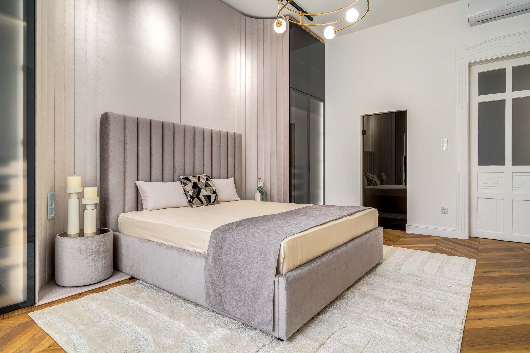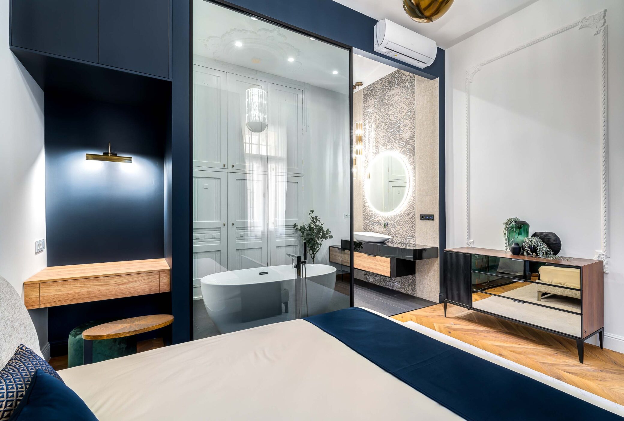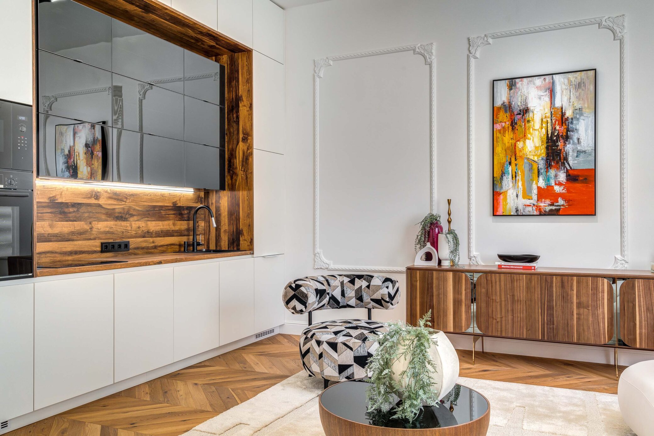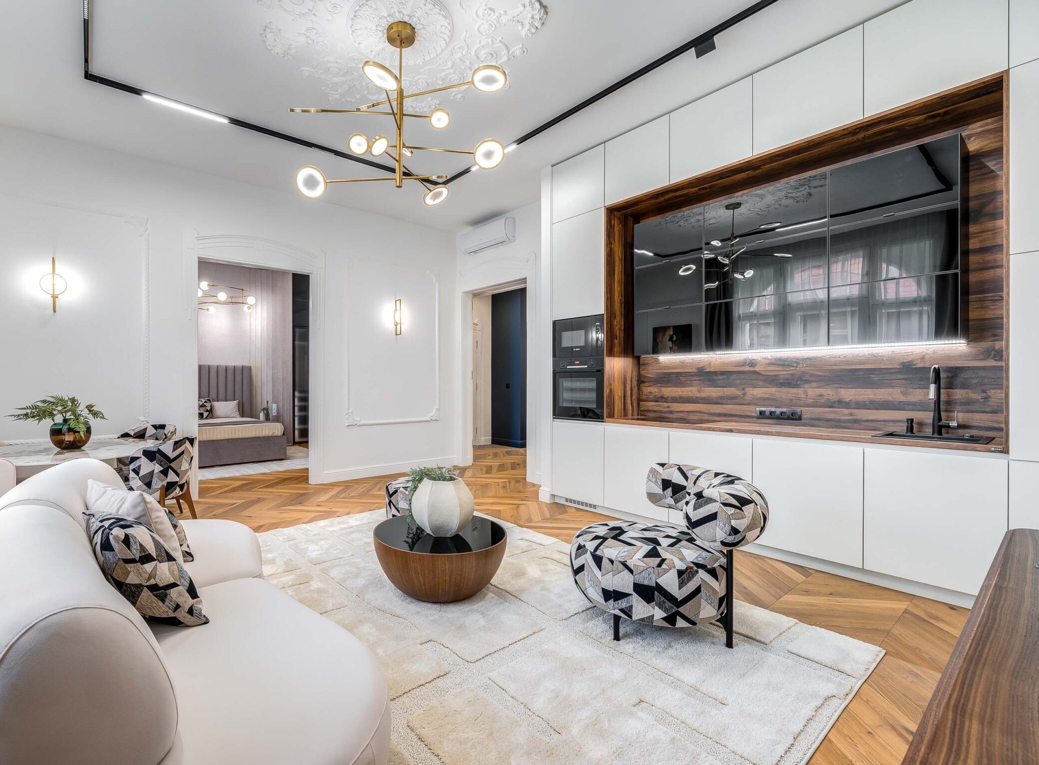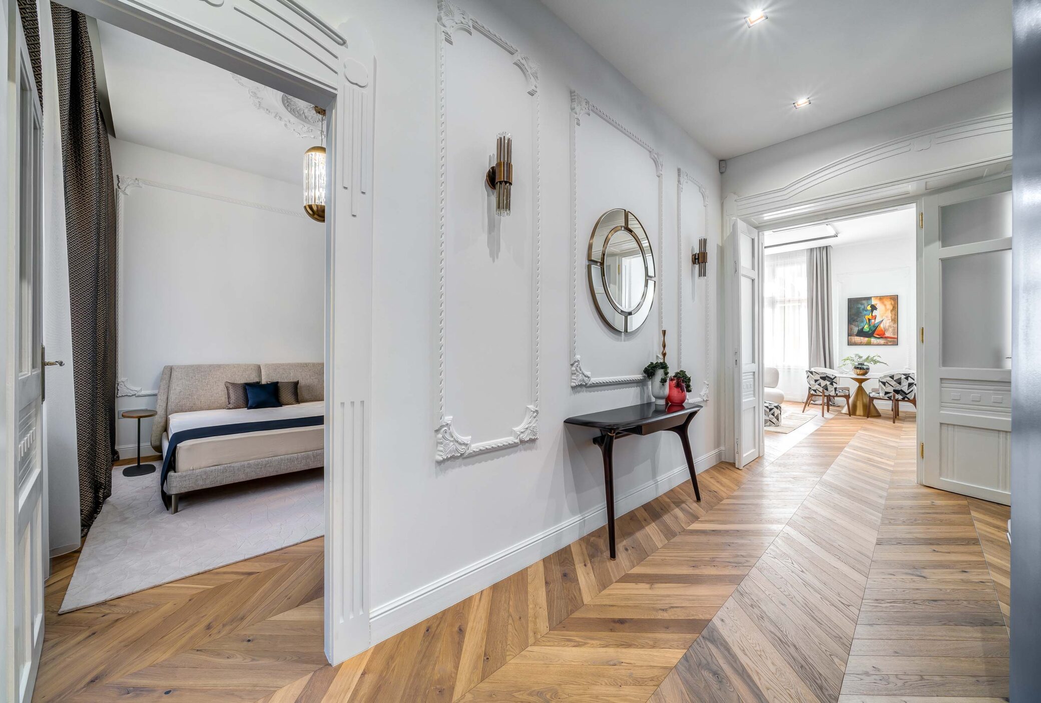 Ebben a belvárosi design apartmanban a prémium anyaghasználat és a mintás felületek uralják a teret.