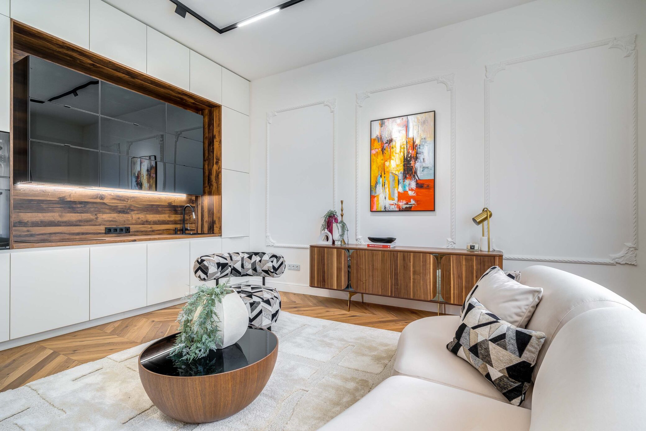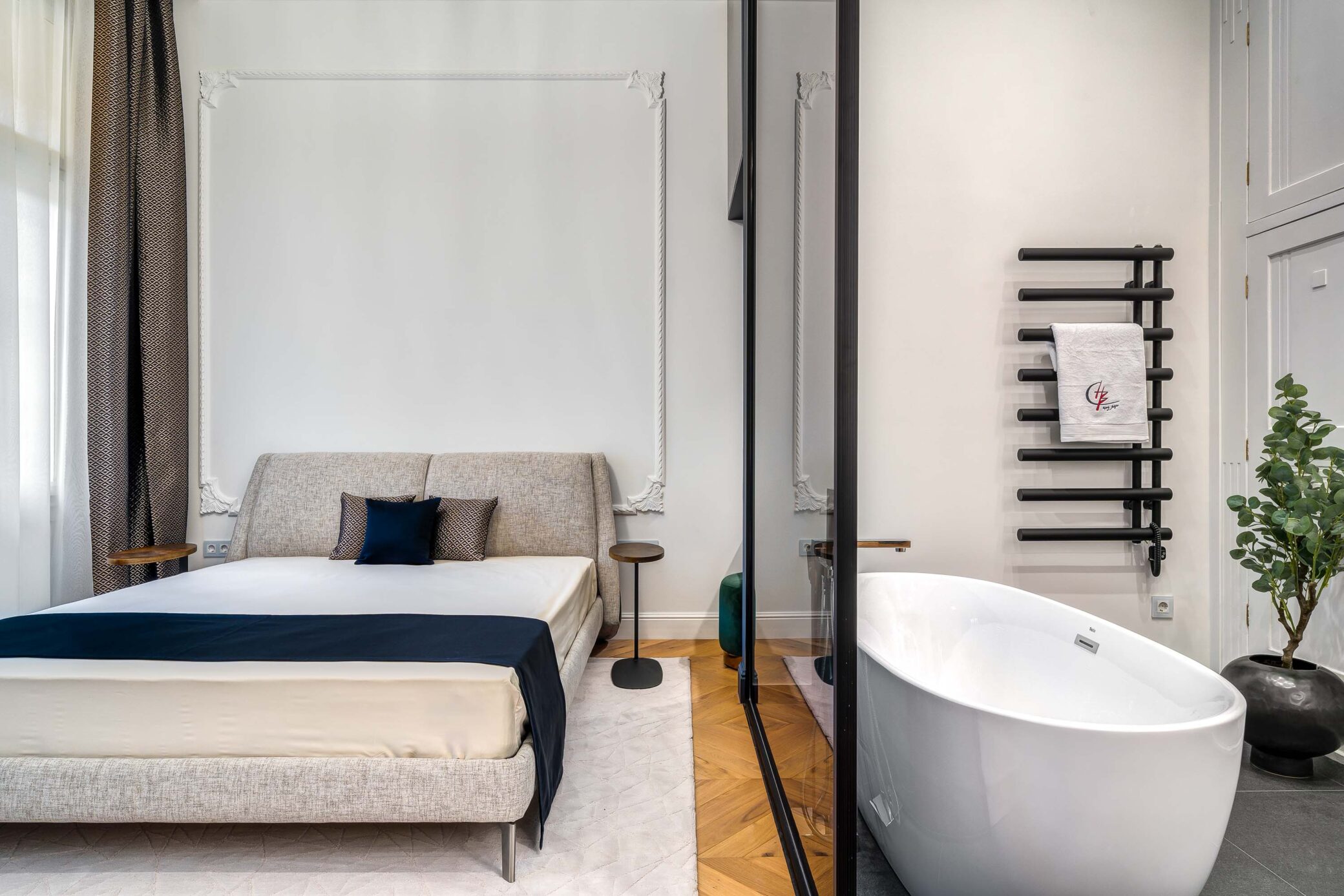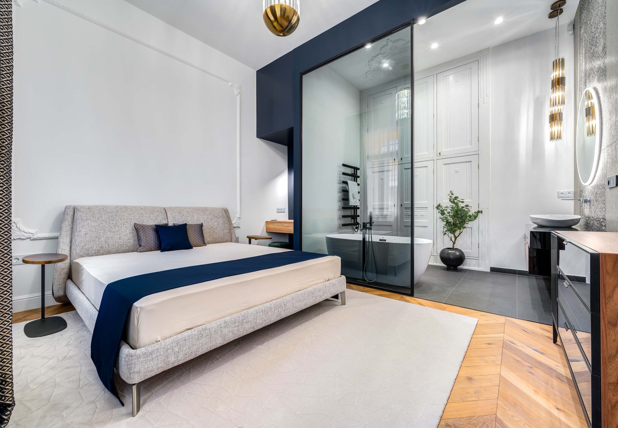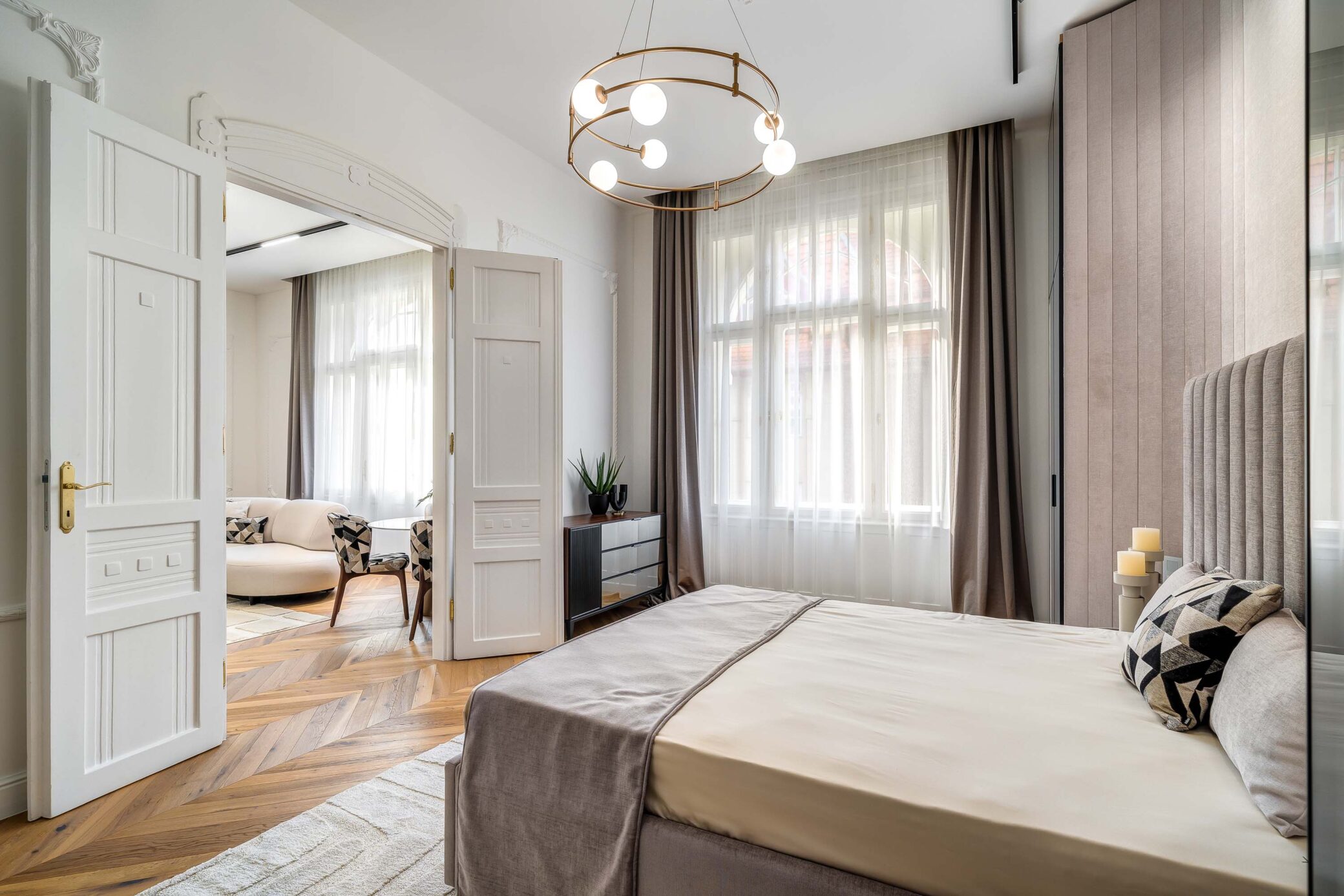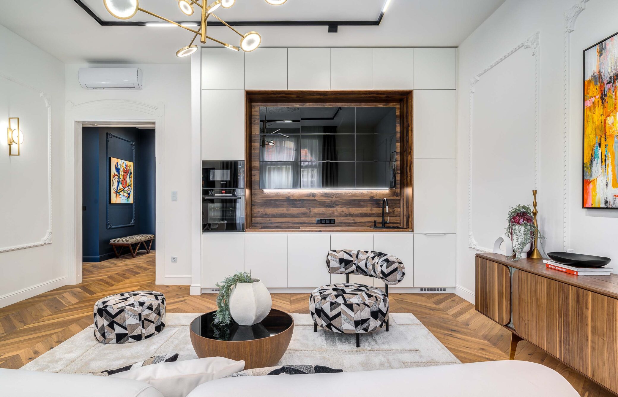 Ebben a belvárosi design apartmanban a prémium anyaghasználat és a mintás felületek uralják a teret.