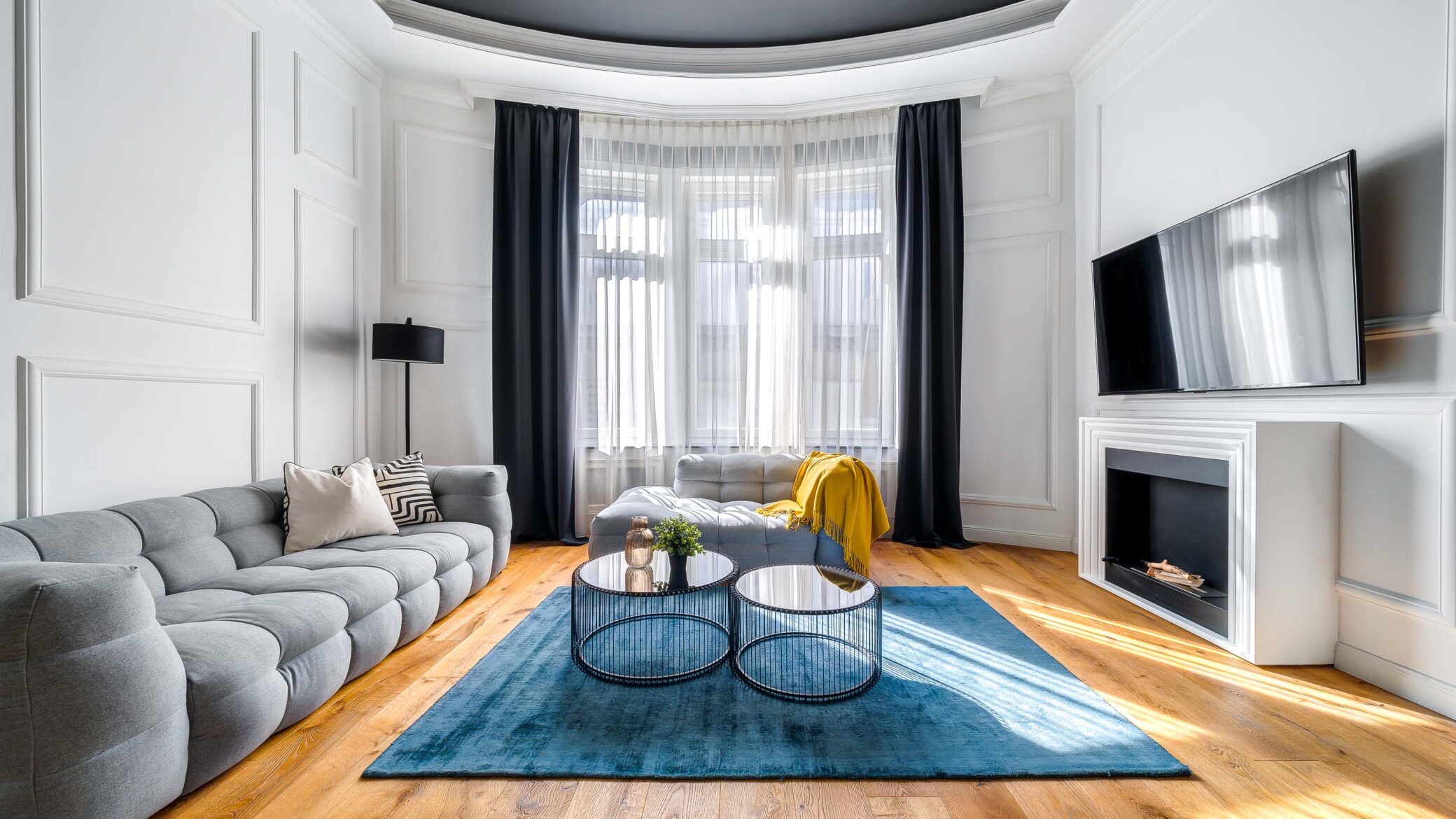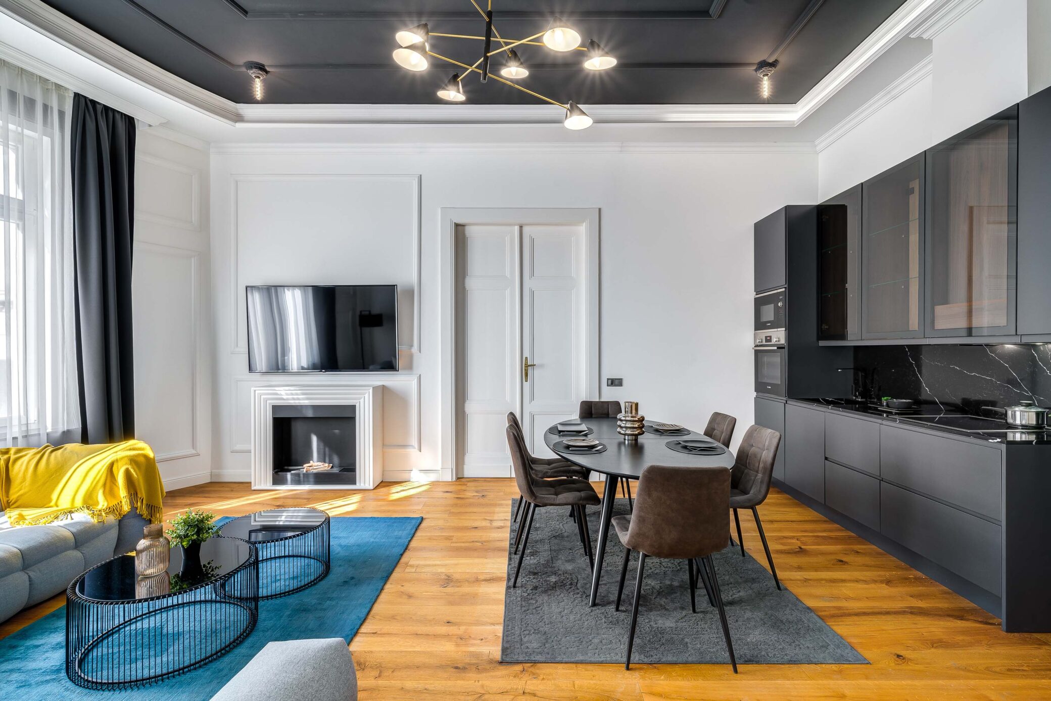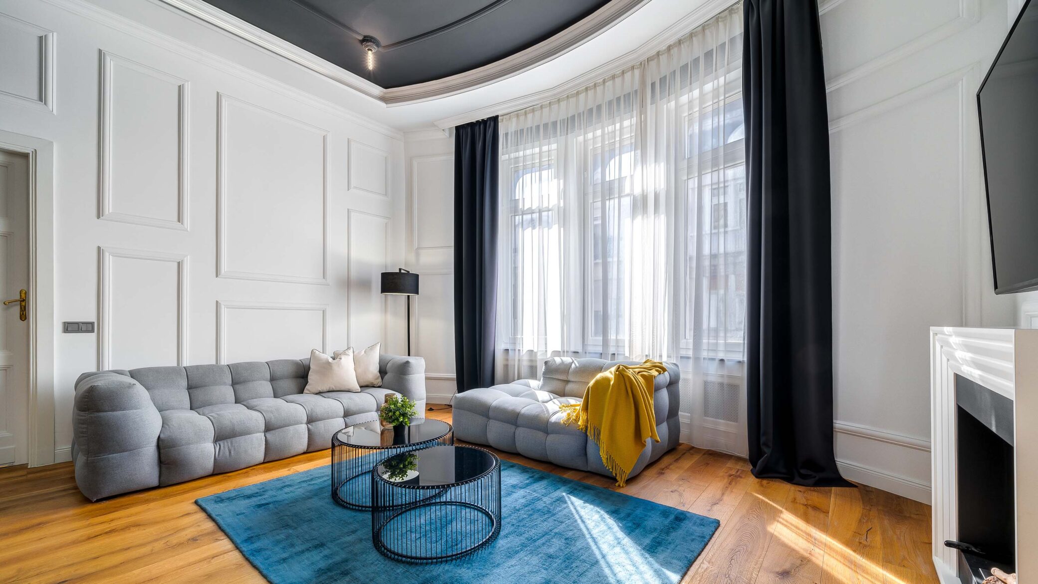 Ebben az apartmanban azonnal feltűnnek a sárga és kék kiegészítők, amelyek energikus kontrasztot teremtenek a térben. A fotózás során a fekete plafon és a fehér, díszes falak játékát kihasználva sikerült kiemelni a maszkulin karakter és a modern dizájn közötti egyensúlyt.