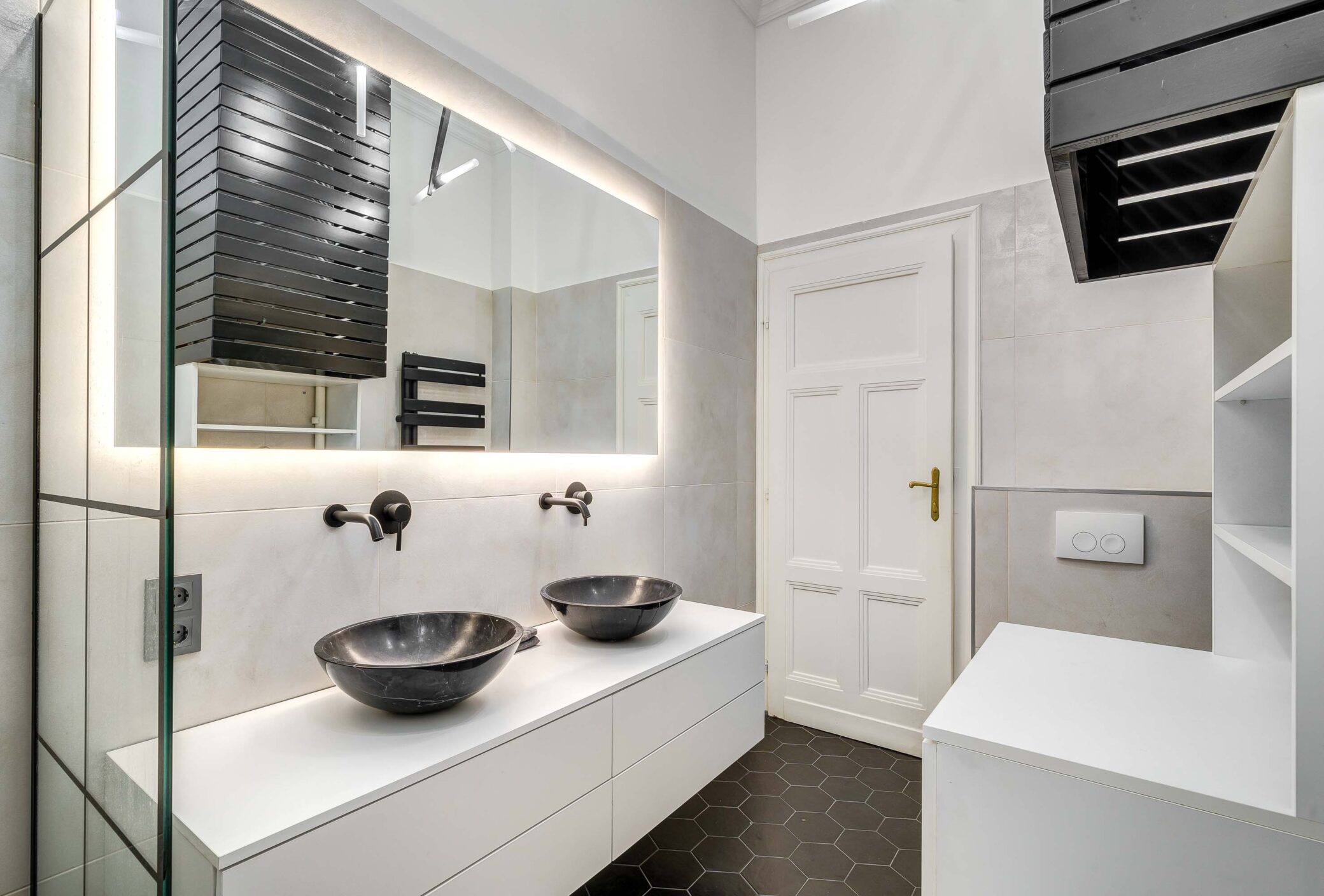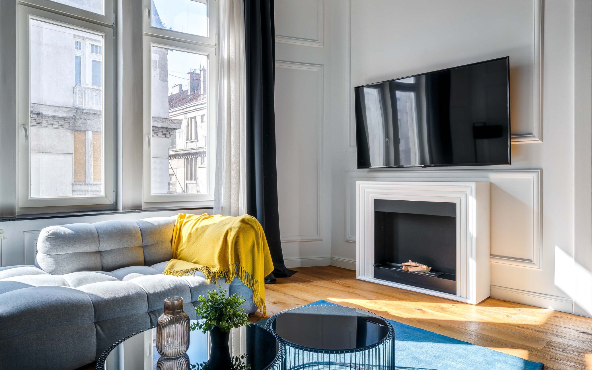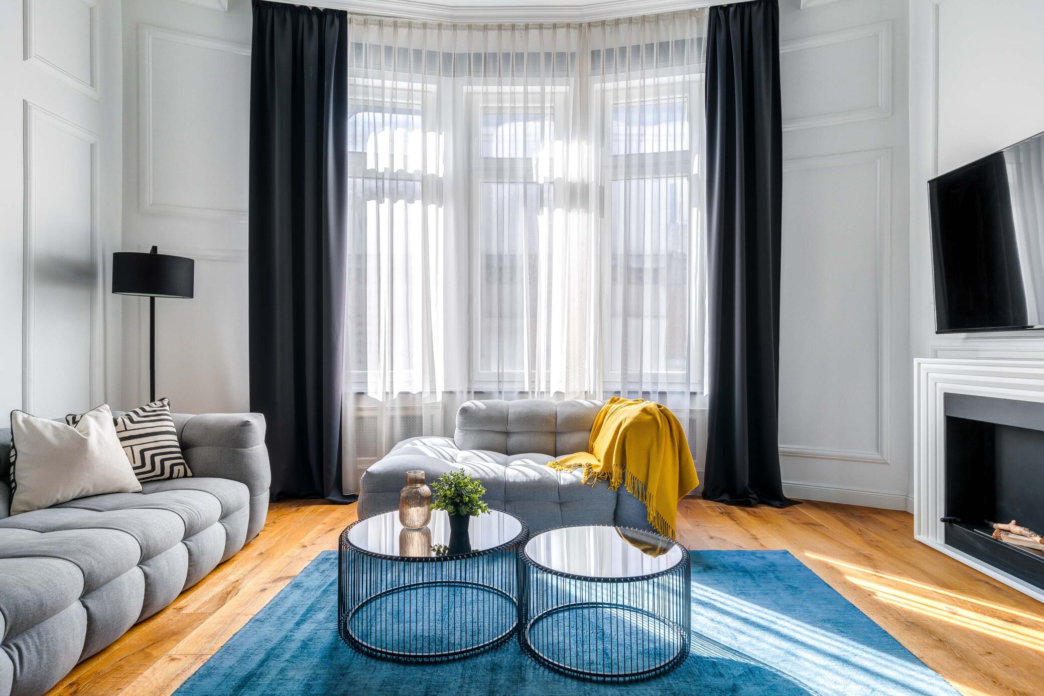 Ebben az apartmanban azonnal feltűnnek a sárga és kék kiegészítők, amelyek energikus kontrasztot teremtenek a térben. A fotózás során a fekete plafon és a fehér, díszes falak játékát kihasználva sikerült kiemelni a maszkulin karakter és a modern dizájn közötti egyensúlyt.