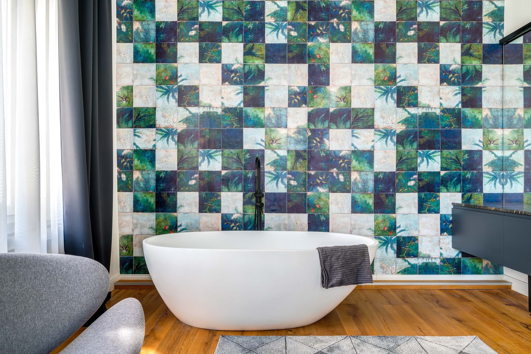 A lakás erős színei ellenére a kompozíció letisztult és átgondolt. A fotókon a részletek – a falak mintázata, a kiegészítők formája – együttesen adják vissza a tér harmóniáját, ahol az energia és a nyugalom tökéletesen kiegyensúlyozódik.