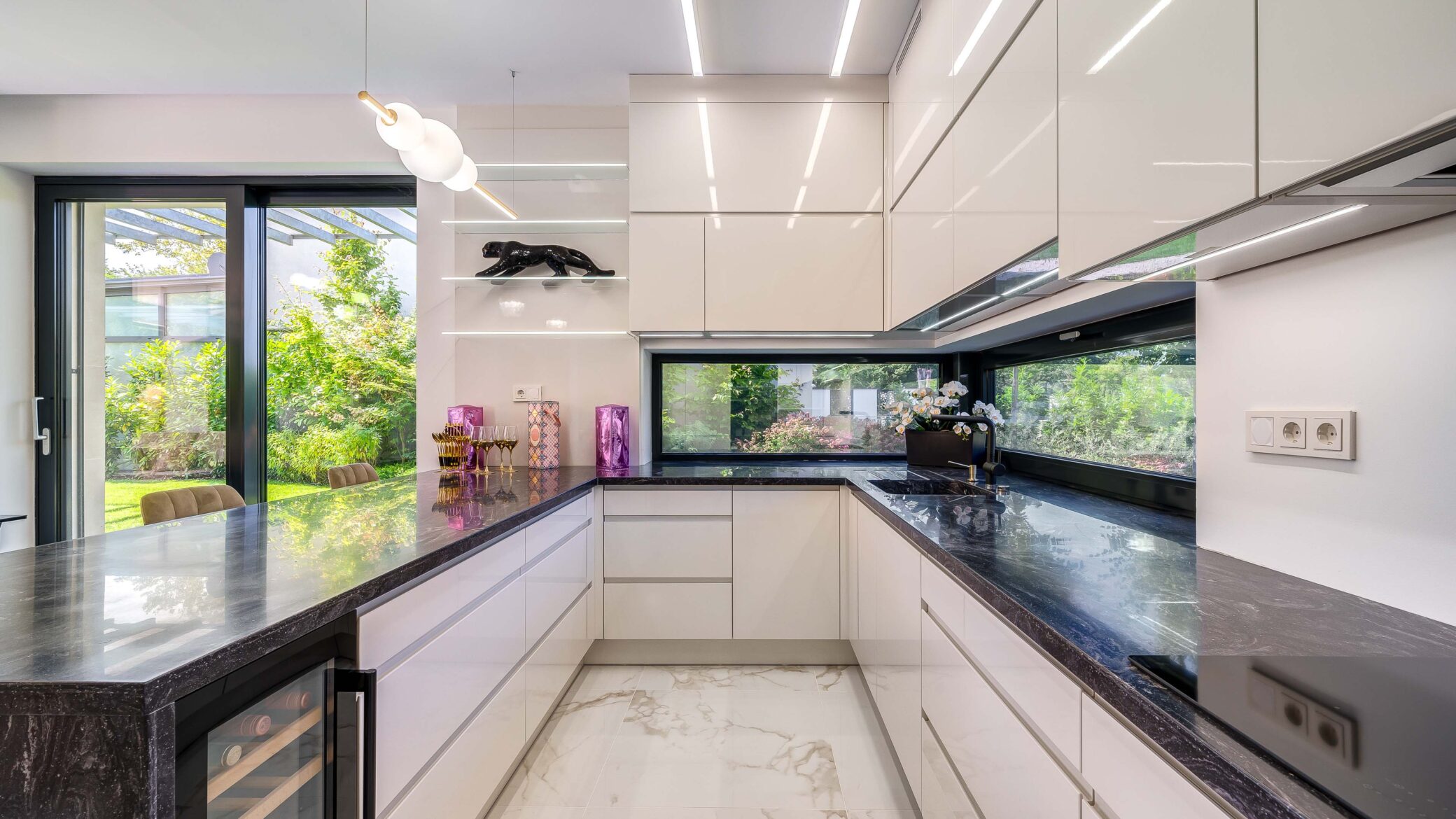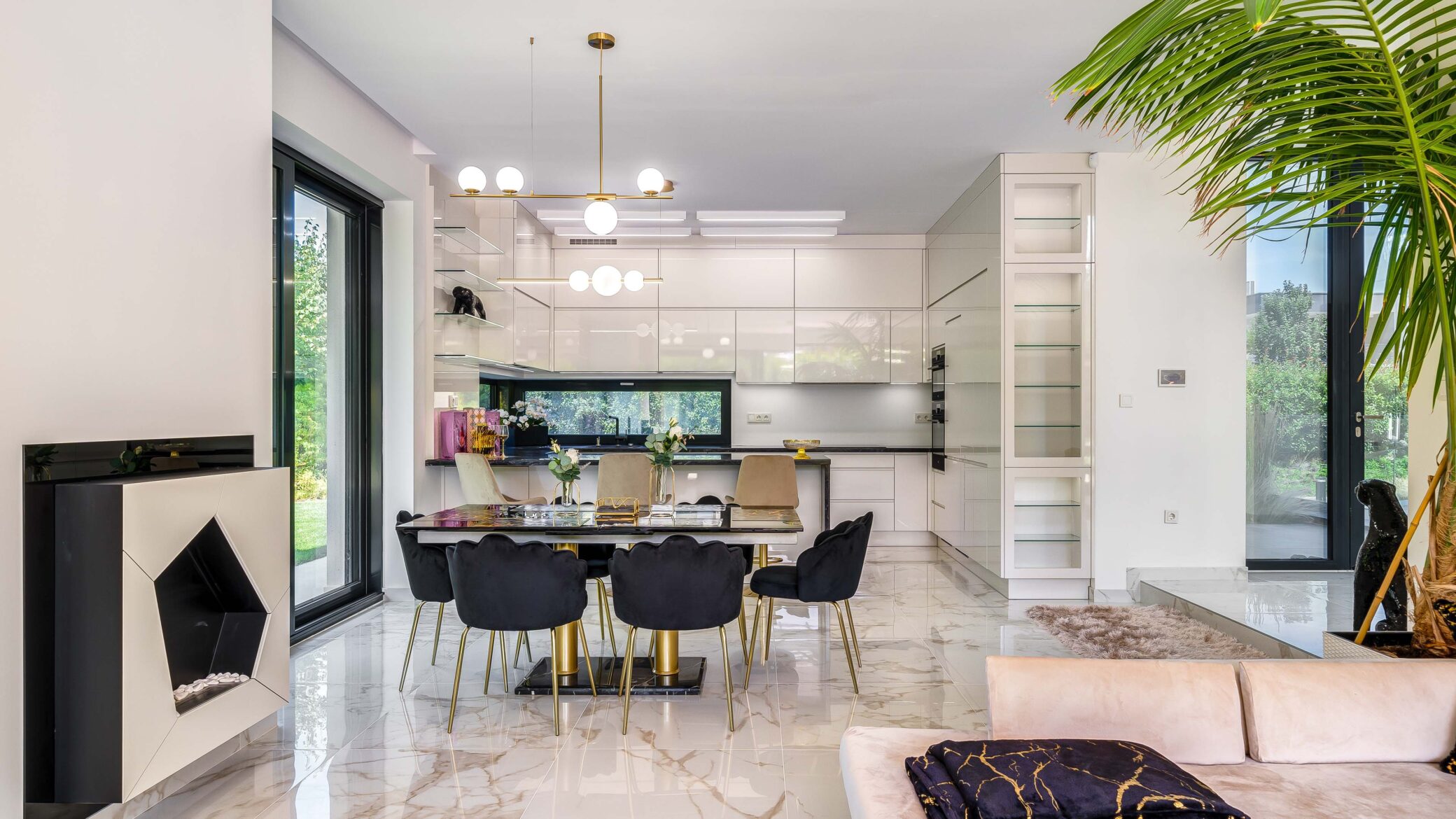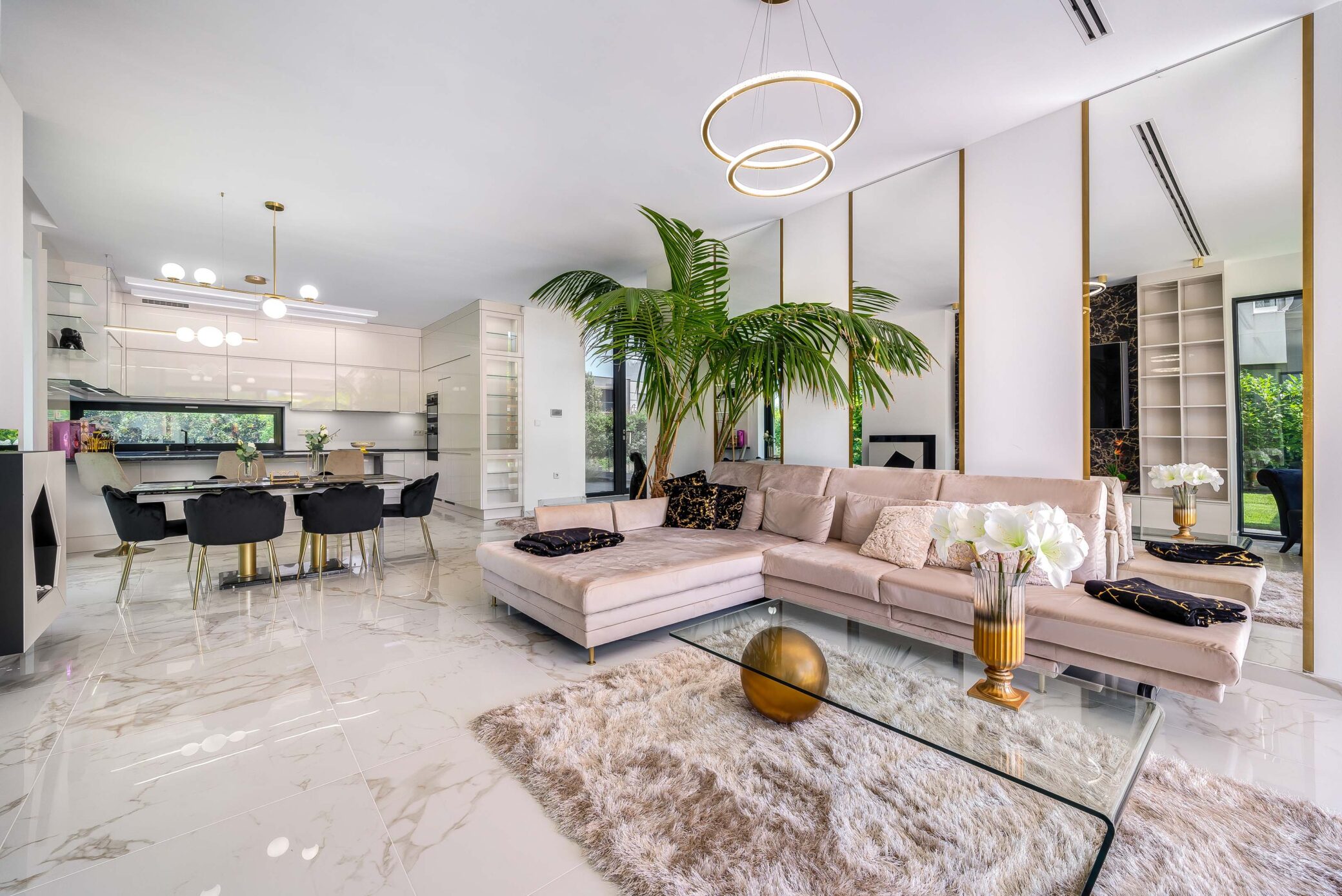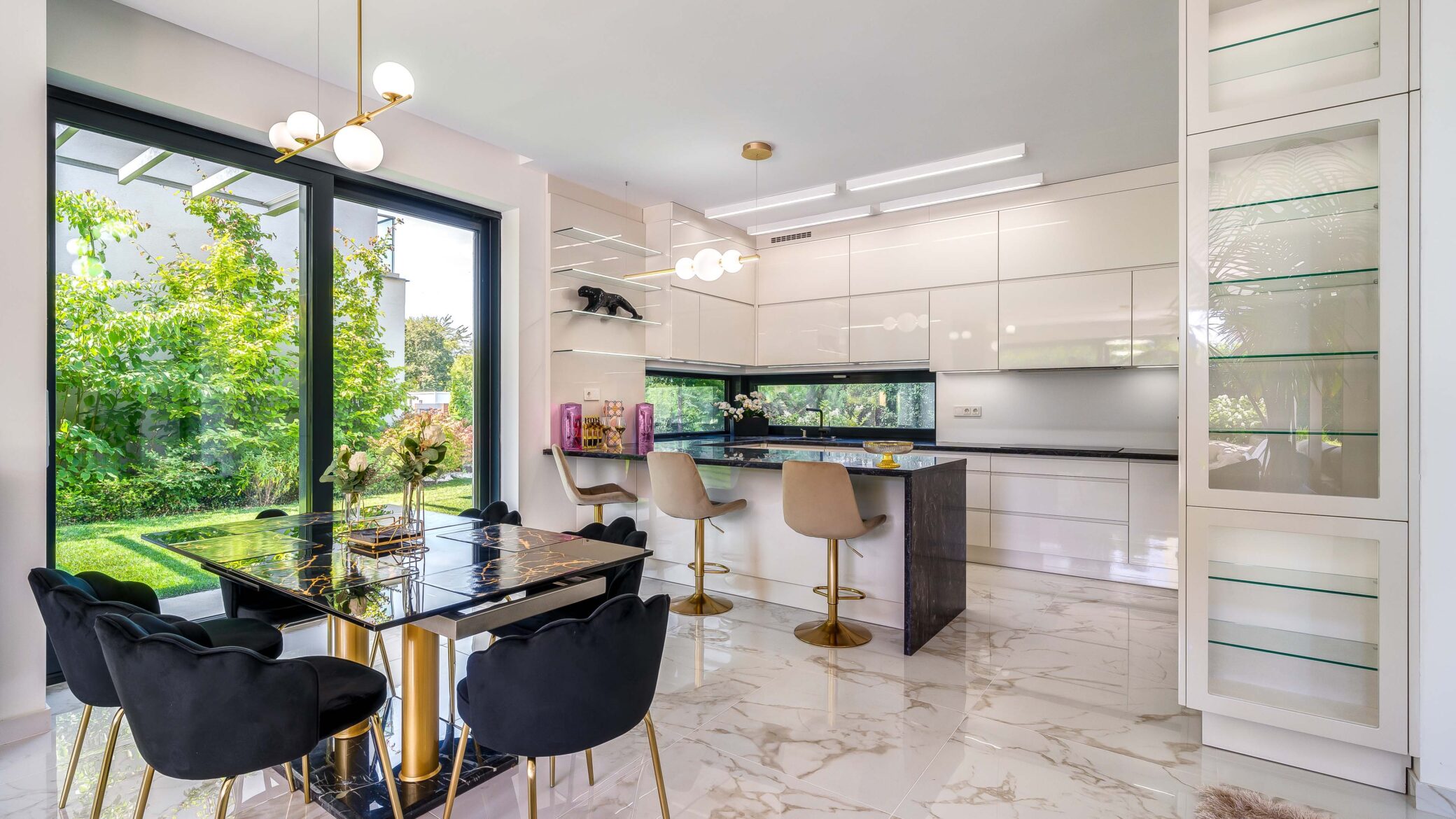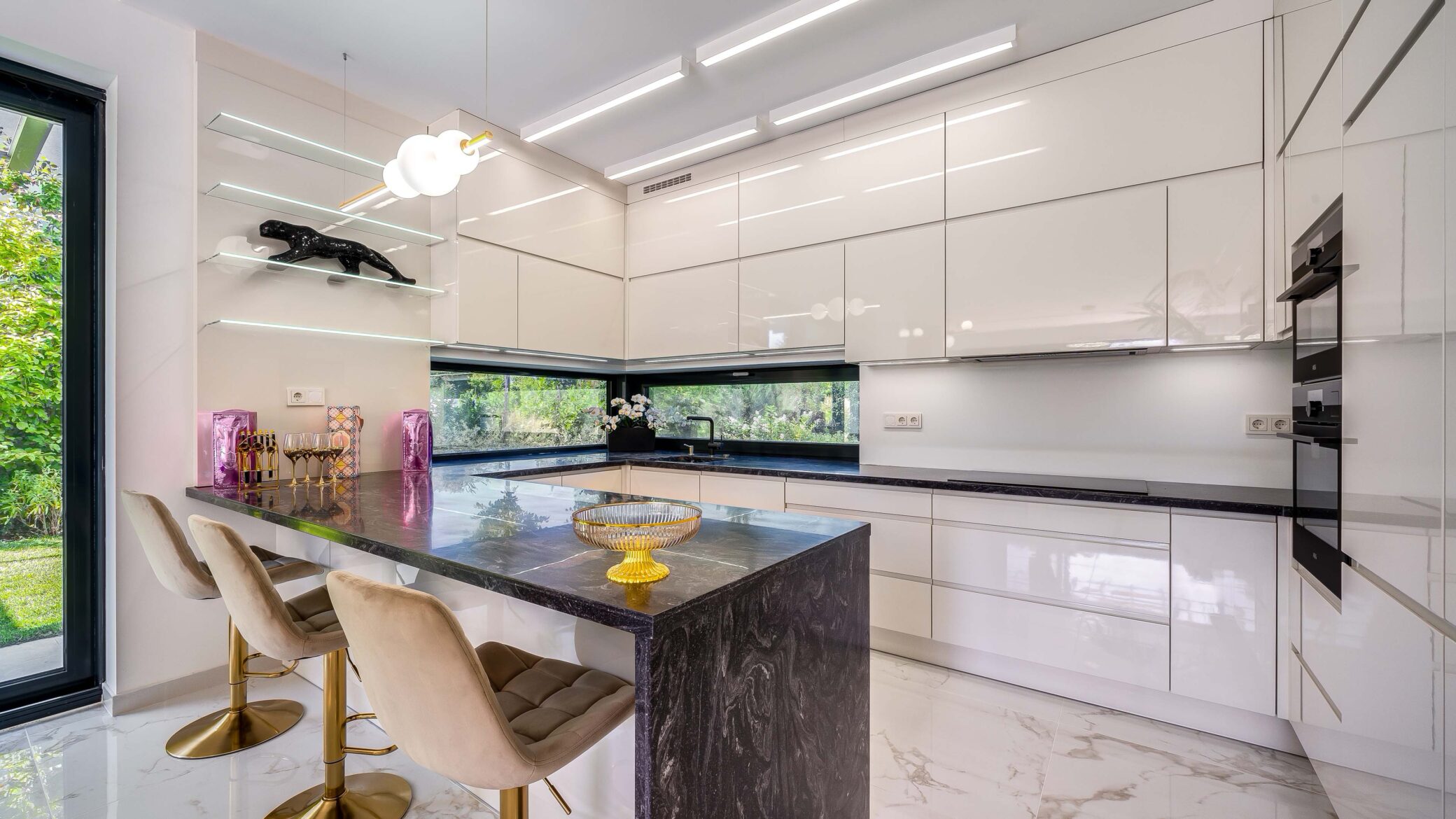 Belül a luxus minden eleme megmutatkozik: ragyogó fehér márványfelületek, arany kiegészítők és modern bútorok együttesen adják vissza a tér kifinomultságát. A fotózás során a fények és tükröződések hangsúlyozták ki a belső tér gazdagságát és tiszta harmóniáját.