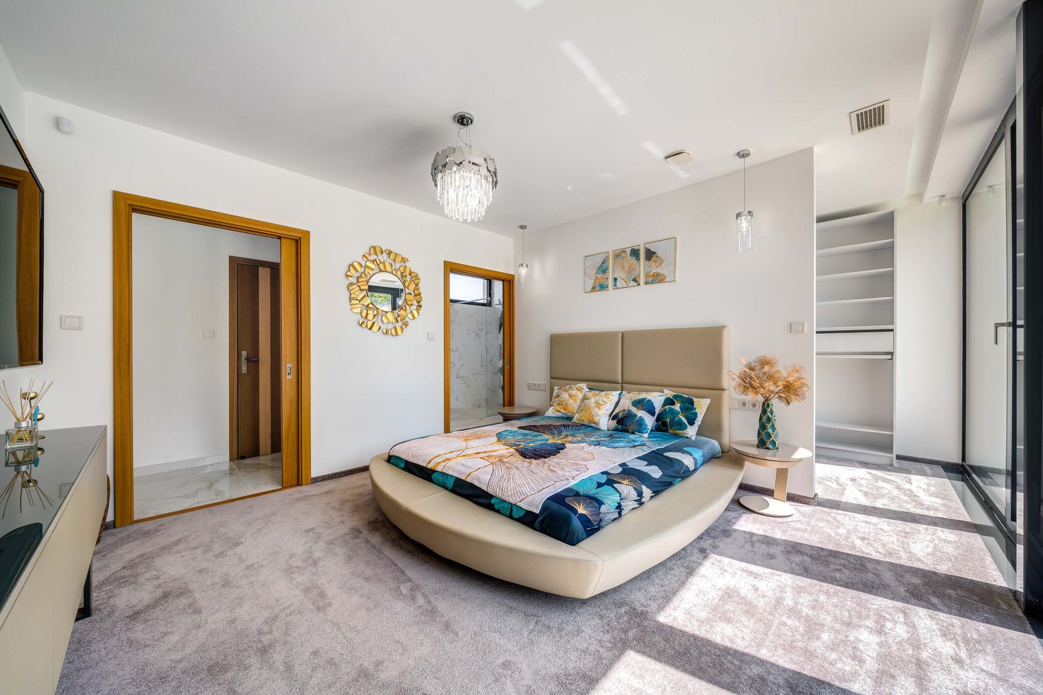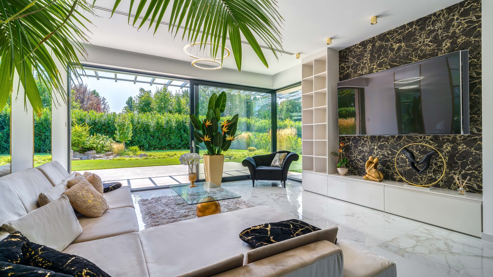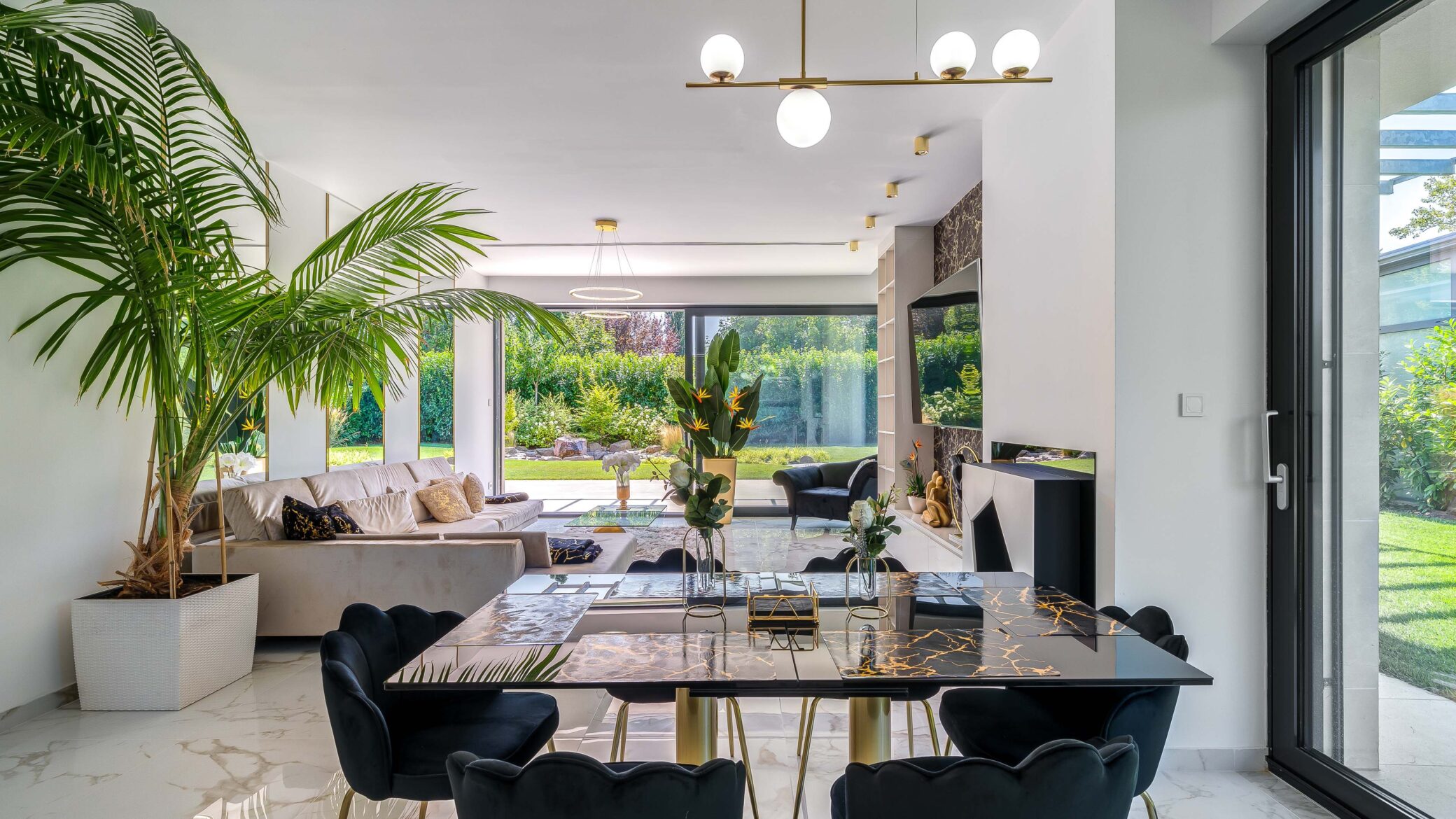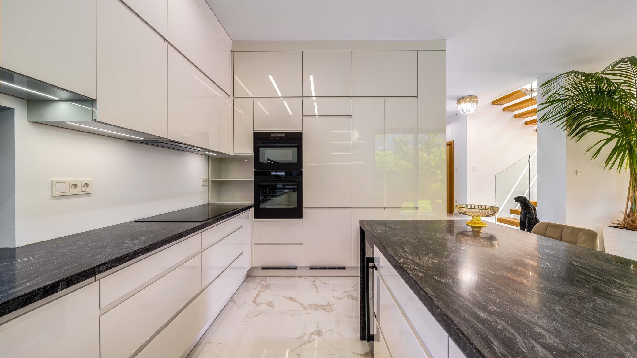 Belül a luxus minden eleme megmutatkozik: ragyogó fehér márványfelületek, arany kiegészítők és modern bútorok együttesen adják vissza a tér kifinomultságát. A fotózás során a fények és tükröződések hangsúlyozták ki a belső tér gazdagságát és tiszta harmóniáját.