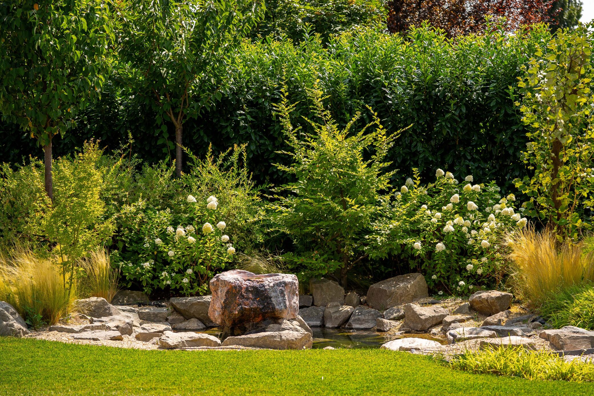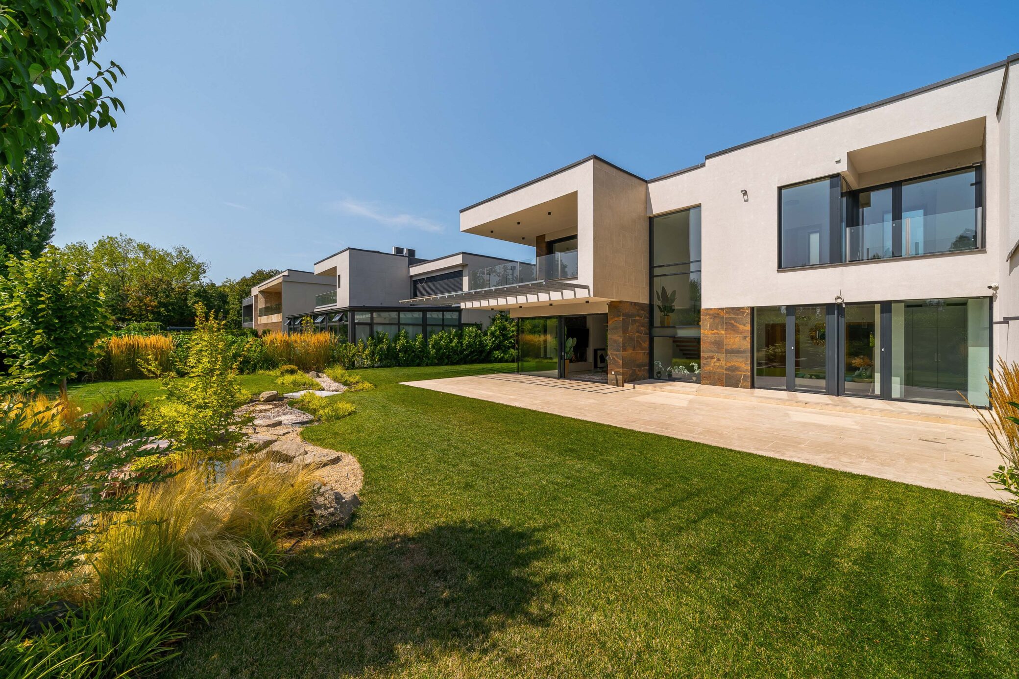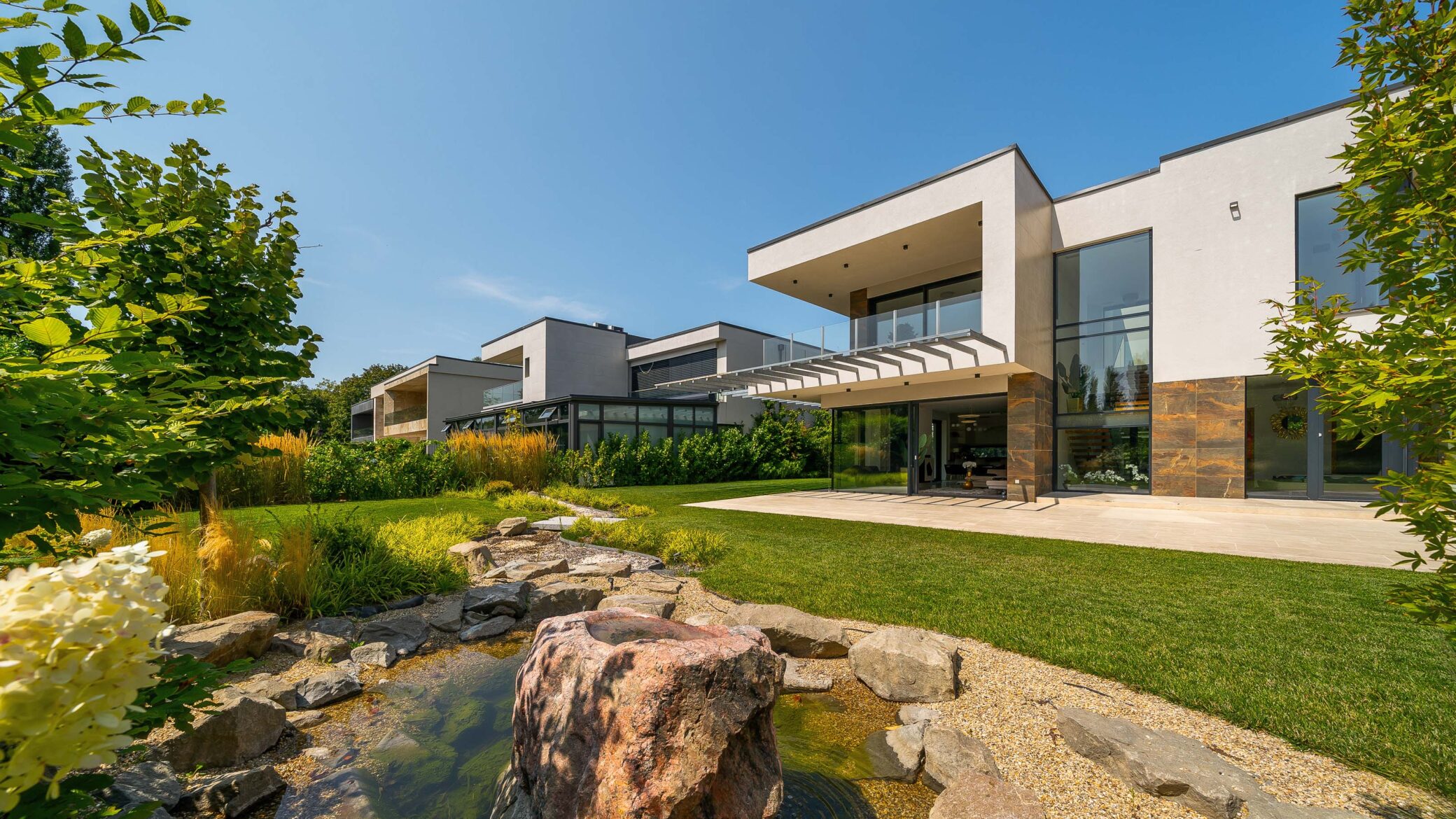 A szökőkút és a patak jelenléte nemcsak vizuális dísz, hanem nyugalmat árasztó háttér is, ami az épület modern megjelenésével együtt különleges atmoszférát teremtett a képeken.